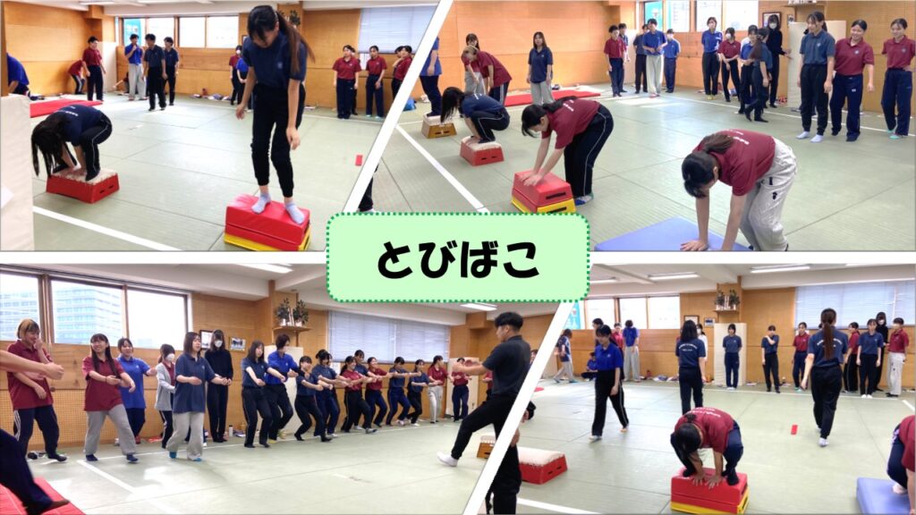 マット運動(手本と補助)、とび箱(手本と補助)、リズム体操、縄跳び。