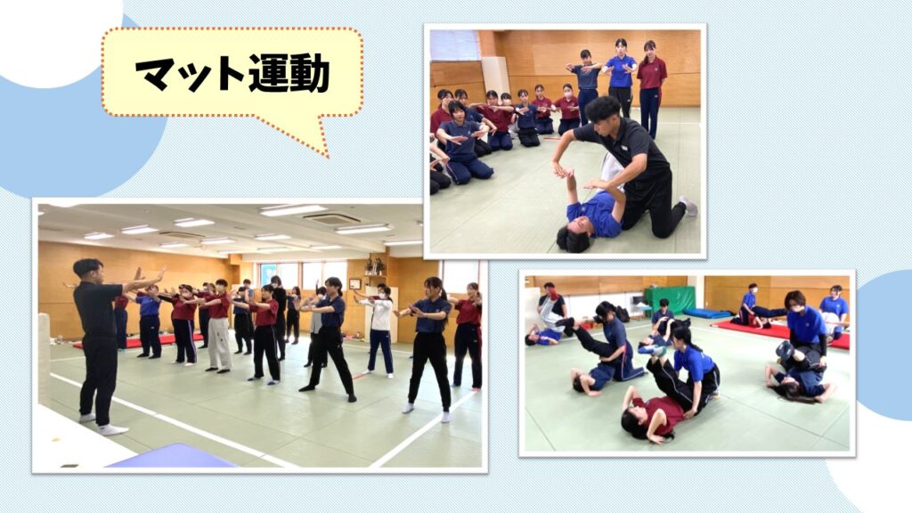 マット運動は、小学校以来と言う学生もいて、「(身体が硬くて)痛~い!笑」と叫びながらも一生懸命頑張っていました😁