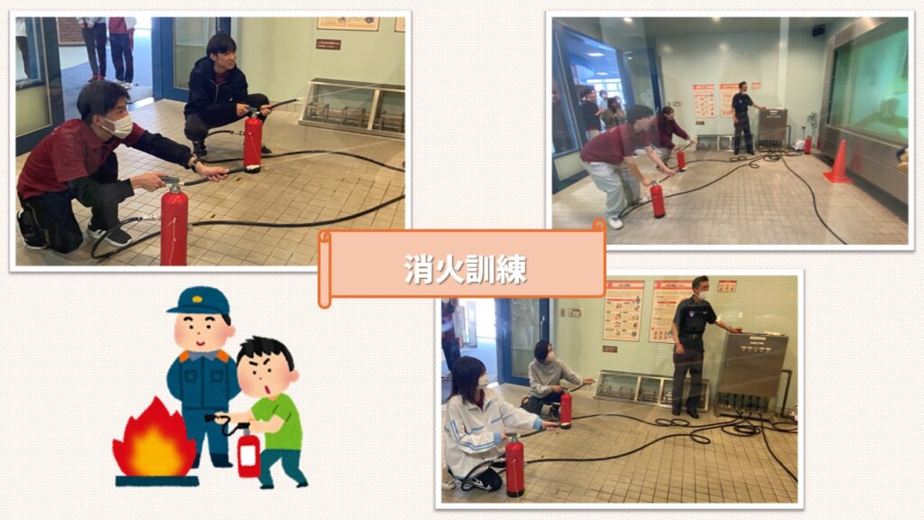 救命処置を学んだ後は、8階の防災体験ひろばに移動し、初期消火の訓練を行いました。