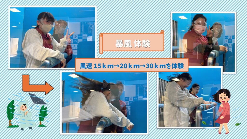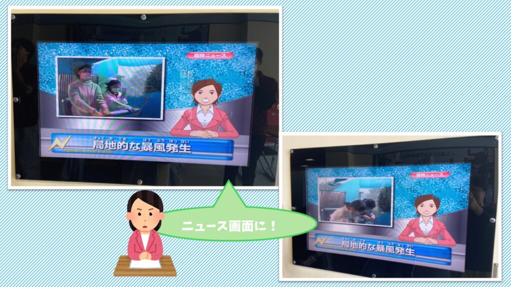 暴風体験の様子は、ニュース画面で放送されていました😆(笑)