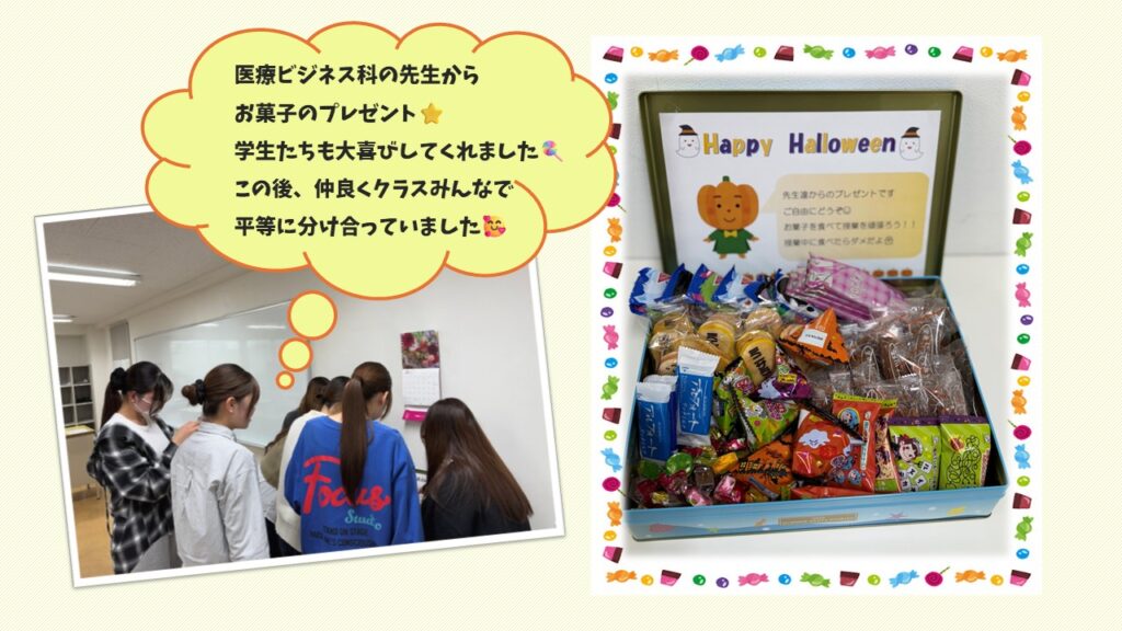 いつも頑張っている学生に医療ビジネス科の先生たちから