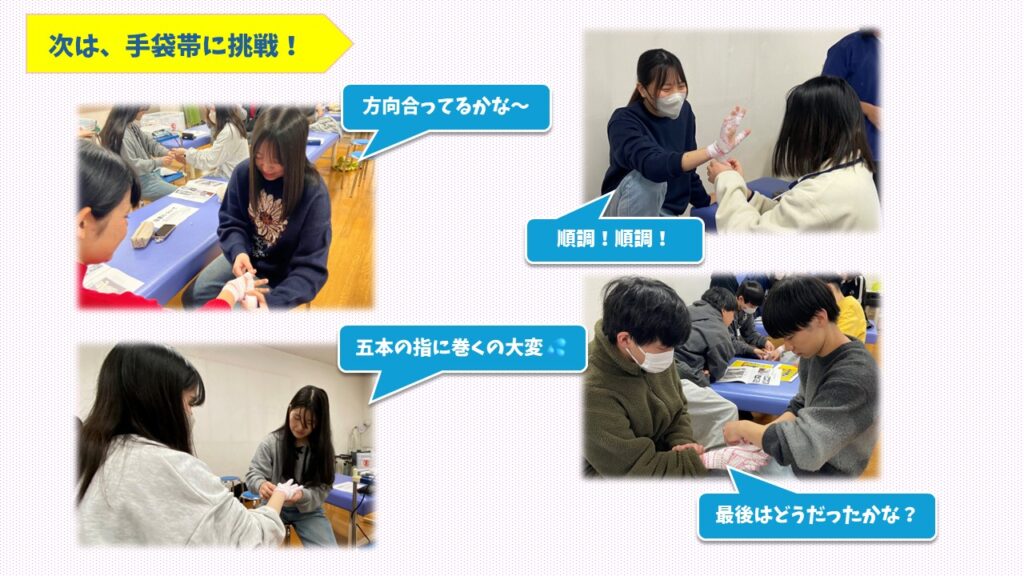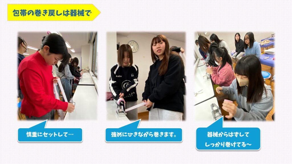 まずは、中嶋先生から、包帯の巻き方の説明と実演を見せていただき、いざ実践!💪🏻✨