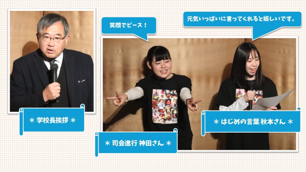 はじめに、3年間学生たちを見守ってくださった校長先にご挨拶頂きました。