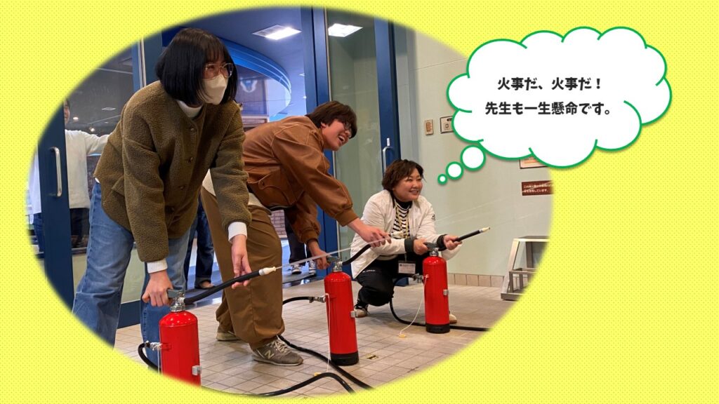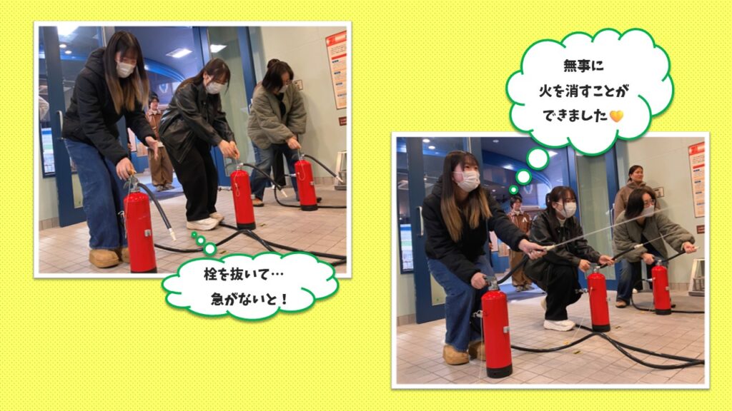 消火器の使い方を学び、火元に向けていざ!