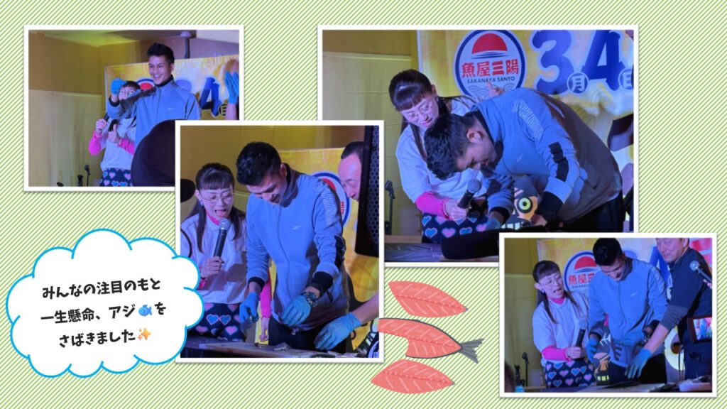 ステージ上でアジをさばくという急展開👀