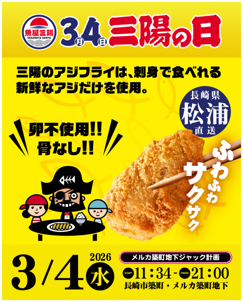 『3月(さん)4日(よん)』に、 揚げたてのアジフライを、『3,400枚』!!