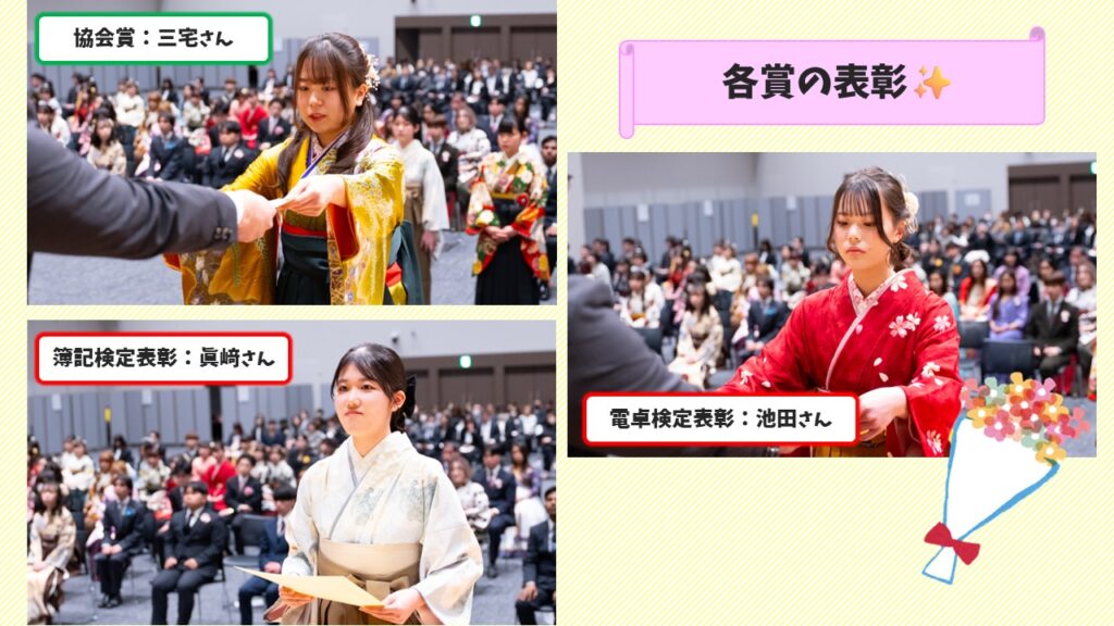 医療ビジネス科からは、総代(卒業生代表)、優秀賞・皆勤賞代表、各検定協会からの表彰もあり